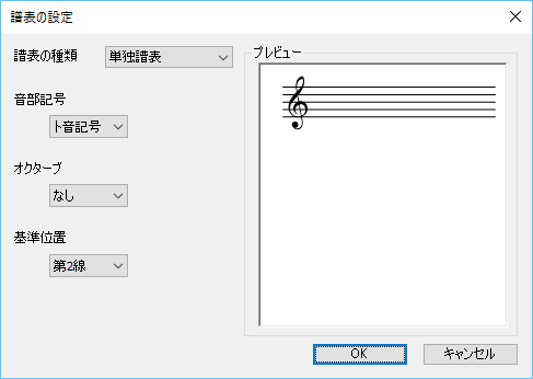 「譜表の設定」ダイアログボックスを開き、選択されているパートの譜表の種類(五線の種類)を譜表の種類で設定します。
