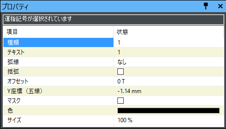 入力済みの運指記号を選択して、プロパティパネルで以下のプロパティを変更できます。