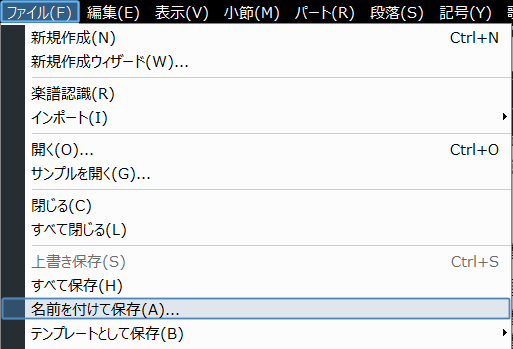 作成した楽譜ファイルを初めて保存するときや、編集中のファイルを別のファイルとして保存するには、ファイル(F)メニューの名前を付けて保存(A)...コマンドを実行します。