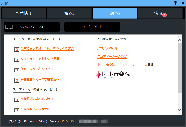 スコアメーカーの使い方を調べることができます。リファレンスマニュアルを開いたり、スコアメーカーの使い方のムービーを見たりできます。