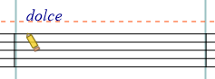 マウスを五線上に移動すると、マウスカーソルの先にdolceが表示されます。 入力したい場所でマウスの左ボタンをクリックするとdolceが入力されます。