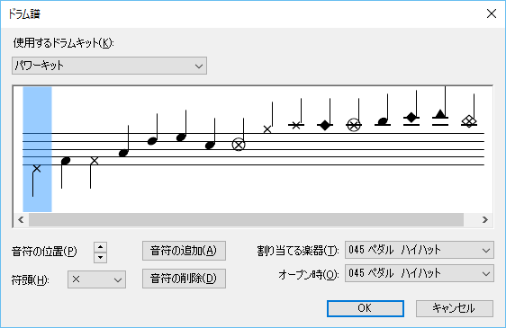 ドラム譜の音符の位置や形状、割り当てる楽器などを任意に設定できます。