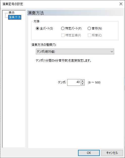 対象が「全パート」か「特定パート」か「音符」かによってリストされる演奏方法の種類が変わります。