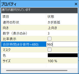 スコアメーカーZEROでは、そのために連符の合計時間をプロパティで変更できるようになっています。