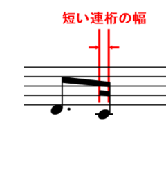 「連桁の太さ」、8分音符より細かいときの「連桁の間隔」や「短い連桁の幅」、入力(設定)時の「連桁の傾き最大値」をそれぞれテンス単位で設定できます。