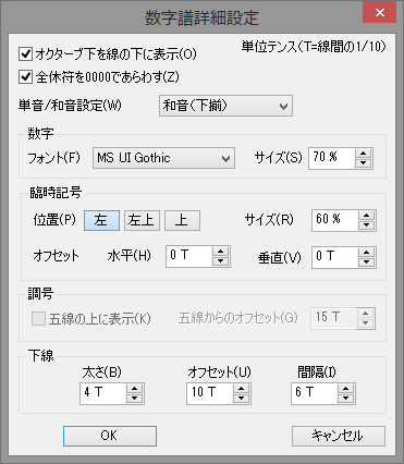 さらに詳細な設定をするためには、詳細設定(D)をクリックし、「数字譜詳細設定」ダイアログボックスを開きます。