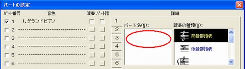 [設定]メニューの[パートの設定]ダイアログボックスを開いて、「パート名」の欄に音色名やパート名を入力すると、各パートの先頭に音色名やパート名を表示させることができます。