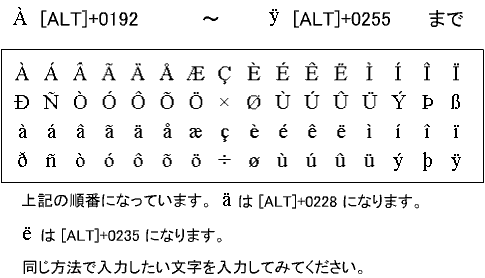 欧文ウムラウトの小文字は、小文字に対応した4桁数字を[ALT]キーを押しながらテンキーで入力してください。 対応数字は以下のようになります。