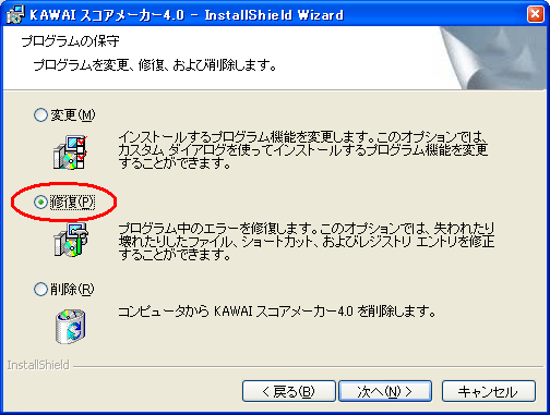 「プログラムの保守」画面に表示されている『修復』を選択し「次へ」ボタンをクリックします。